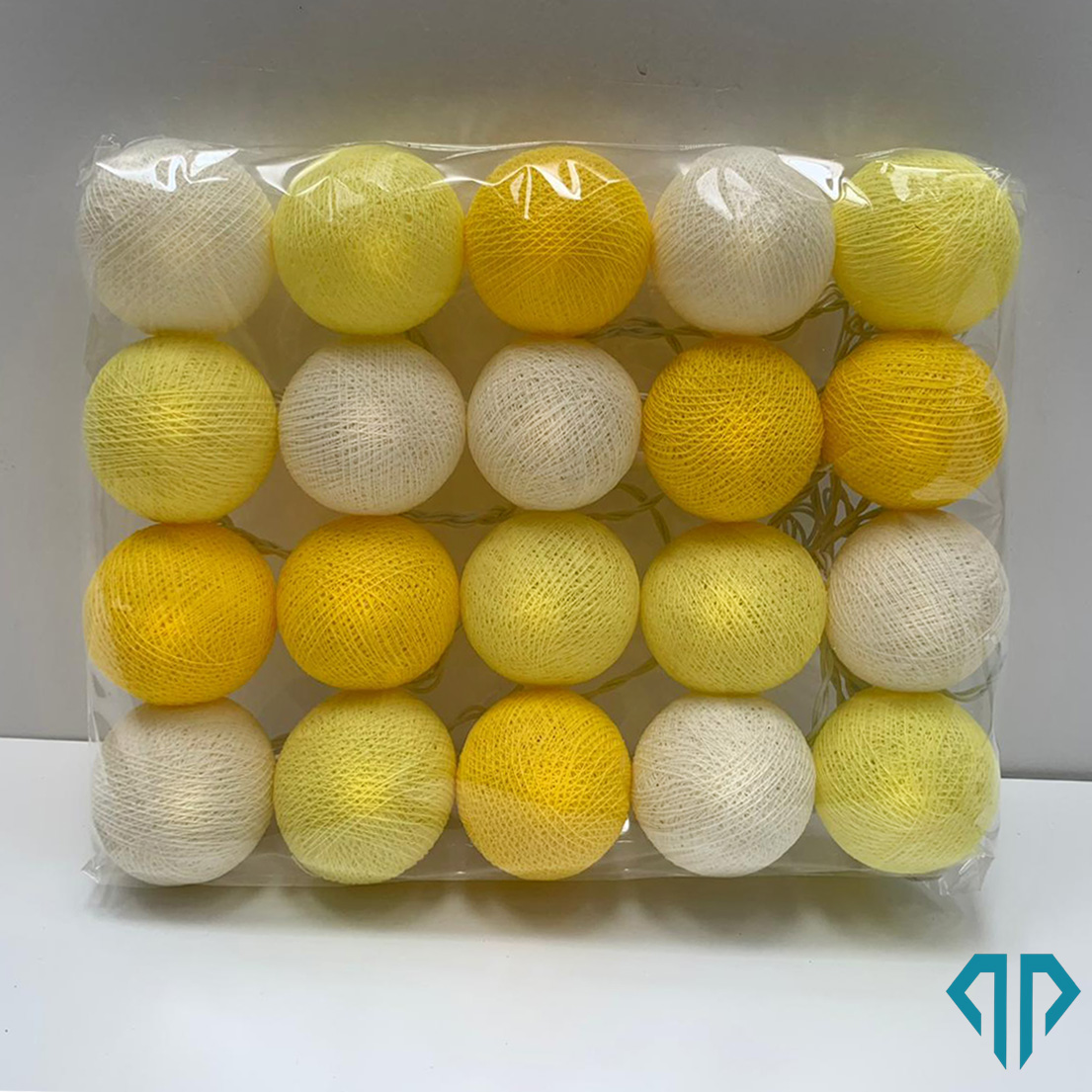 Τα φωτάκια από βαμβακερό νήμα είναι πολύ διάσημα διεθνώς σαν Cotton ball lights. Αποτελούνται από 20 πολύχρωμες ολοστρόγγυλες σκληρές χειροποίητες μπάλες DIY (Do It Yourself) διαμέτρου 6,6cm Τα φωτάκια- καλώδια είναι ειδικών προδιαγραφών CE ML -20 L / Spec : 220 V /1,2 V / 0.2 A , Max 0.24 W για απόλυτη ασφάλεια. Το φως τους αντίθετα με τα led διαχέεται σφαιρικά είναι ζεστό δεν είναι μιας χρήσης και είναι κατασκευασμένα για πολύχρονη χρήση, έχοντας 3 ανταλλακτικά λαμπάκια. Υποστηρίζονται τεχνικά τόσο για τα λαμπάκια, τις μπάλες όσο και για καινούρια σειρά. Χρόνια θα σας κάνουν παρέα! Το ζεστό φως περνώντας μέσα από το βαμβακερό νήμα δημιουργεί ένα εκπληκτικό αποτέλεσμα! Οι φωτεινές χειροποίητες μπάλες Cotton ball lights προσφέρουν πολύ ευχάριστο ατμοσφαιρικό φως κάνοντας τον εσωτερικό χώρο ζεστό. Χάρη στην πλούσια παλέτα χρωμάτων μπορείτε να δημιουργήσετε συνθέσεις που ταιριάζουν σε κάθε εσωτερικό χώρο. Βλέπουμε Cotton light balls σχεδόν παντού: Σε σαλόνια, υπνοδωμάτια, κουζίνες, παιδικά δωμάτια, σκάλες διαδρόμους, πέργολες, μπαλκόνια, ακόμη και σε γραφεία σε καταστήματα σε βιτρίνες σε μπαρ!